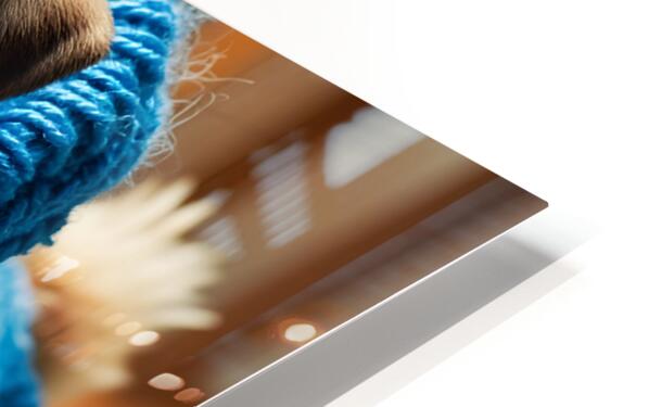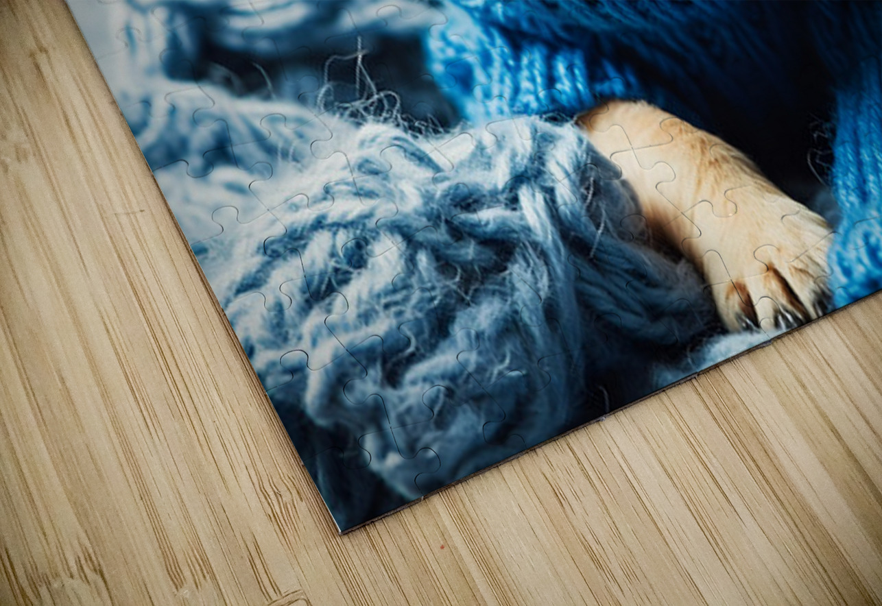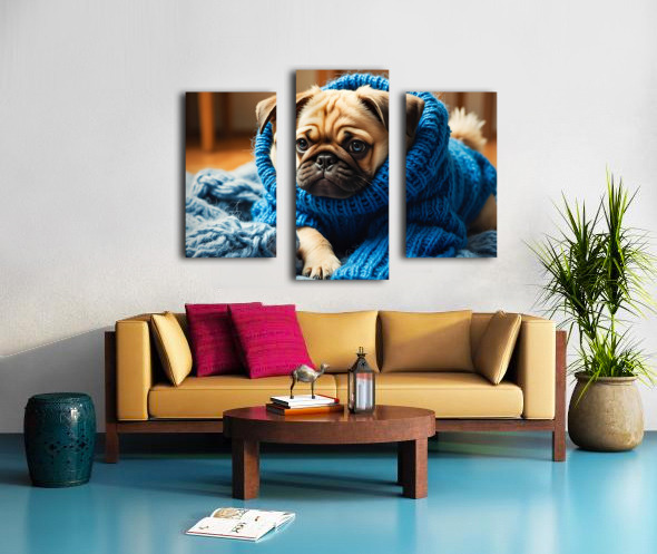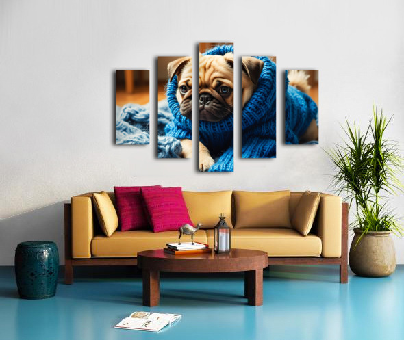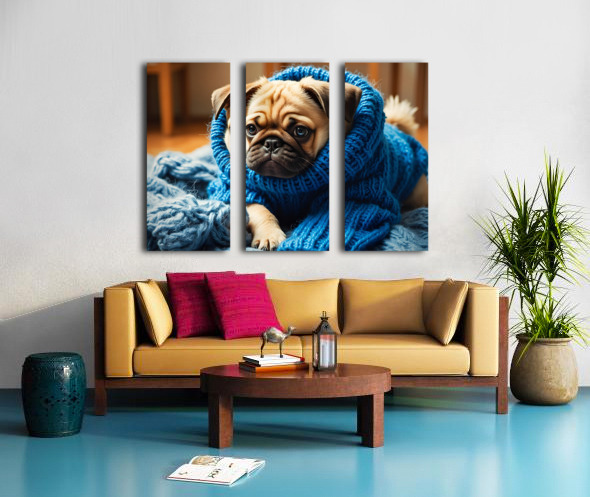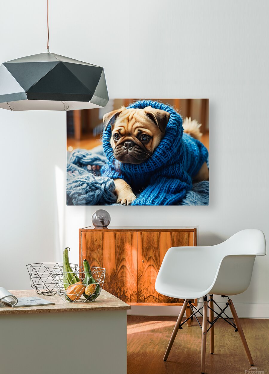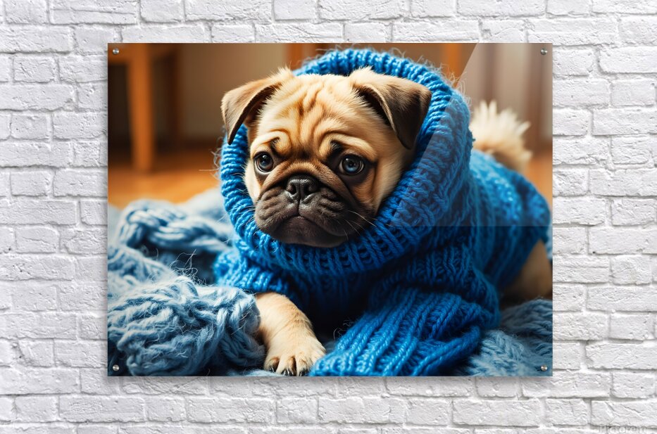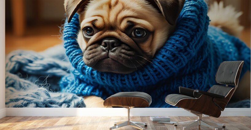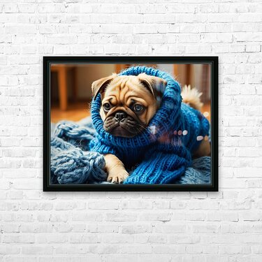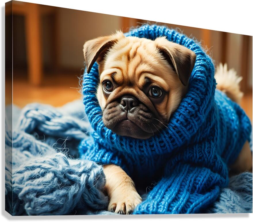 An adorable tan pug puppy with characteristic wrinkled features peeks out from a blue knitted sweater sleeve showing only its curious black nose and part of its face in a warm indoor environment Digital Artwork.