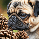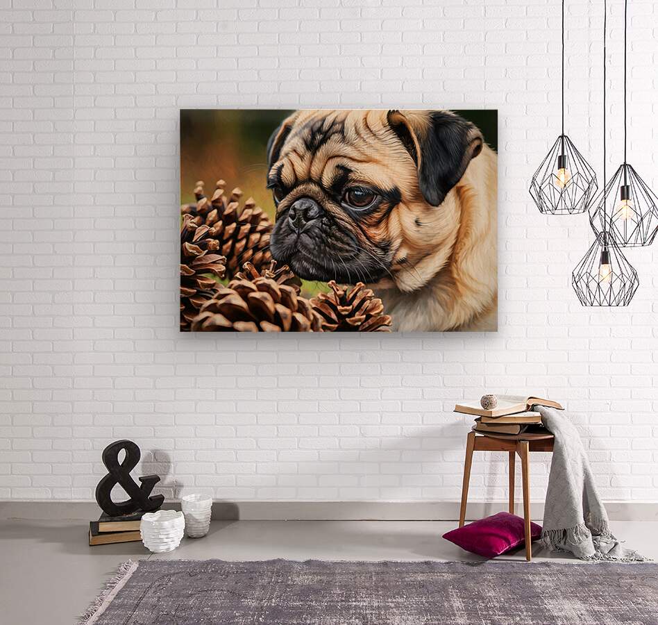 An adorable tan and black pug puppy with characteristic wrinkled face sits on polished wooden flooring curiously leaning forward with pink tongue extended as it investigates cinnamon sticks and pine cones scattered nearby Digital Artwork.