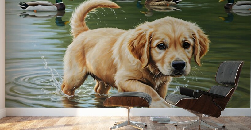 The delighted golden retriever puppy splashes playfully in the shallow water while friendly ducks swim nearby water droplets catching sunlight as everyone enjoys this peaceful pond gathering Digital Artwork.
