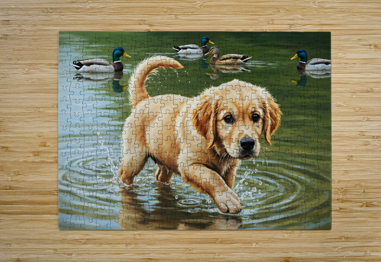 Happy Golden Retriever Puppy Plays With New Duck Friends At Pond Puppy Prints Puzzle printing