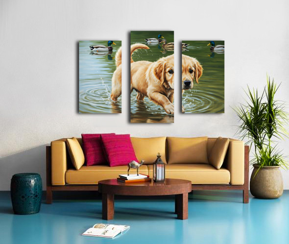 Happy Golden Retriever Puppy Plays With New Duck Friends At Pond Canvas print