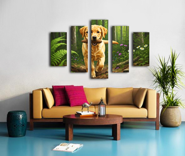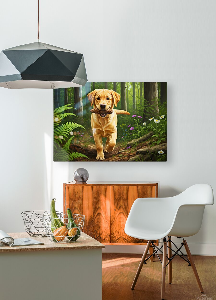 The content golden Labrador puppy relaxes beside its pinecone prize panting gently with tongue out settled on the comfortable moss-covered forest ground Digital Artwork.
