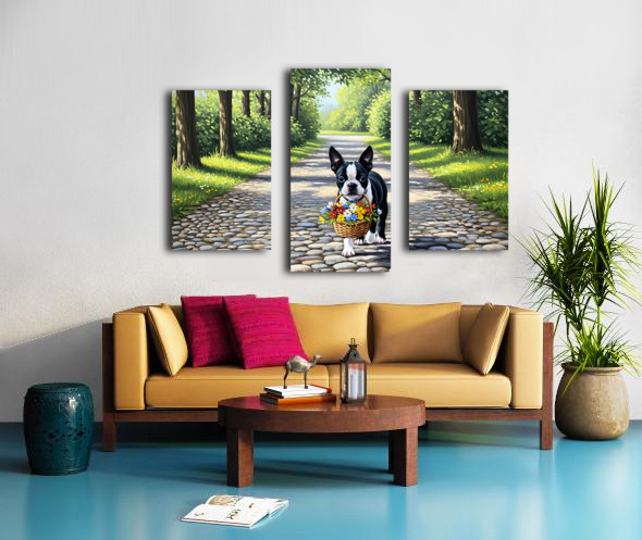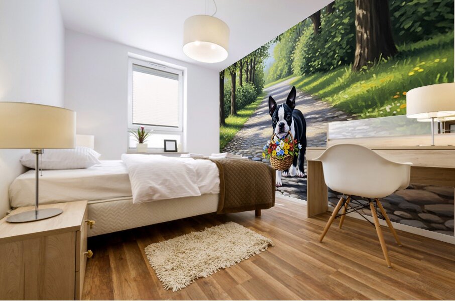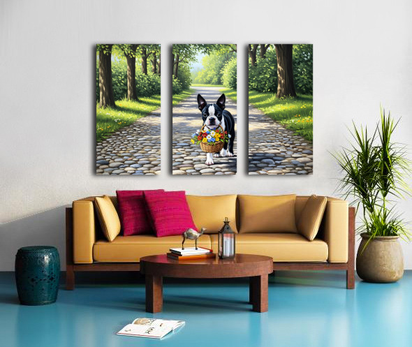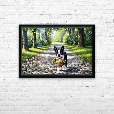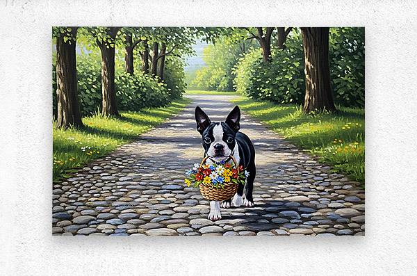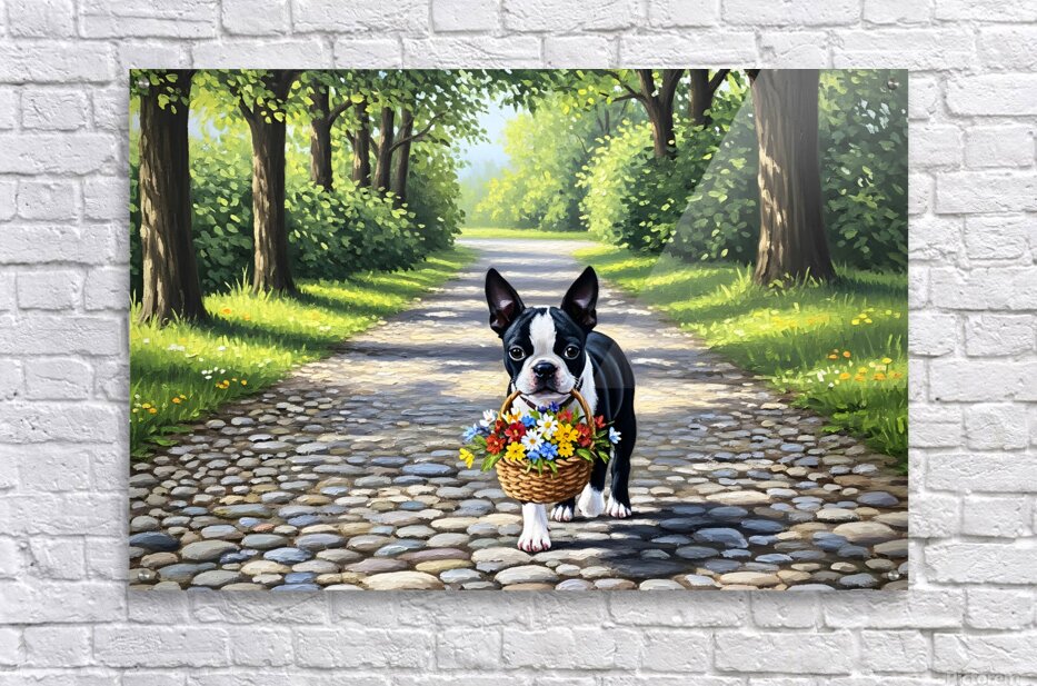 Get this artwork "Boston Terrier Puppy With Flower Basket In Garden" in a framed print.