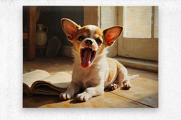 ABOUT THIS ARTWORK: SLEEPY CHIHUAHUA PUPPY DREAMS OVER OPEN BOOK