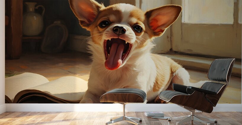 An adorable brown and white Chihuahua puppy peacefully sleeps with its tiny head nestled on an open book. The puppys ears are relaxed and its eyes are gently closed as warm sunlight creates a cozy reading nook on the carpet. Digital Artwork.