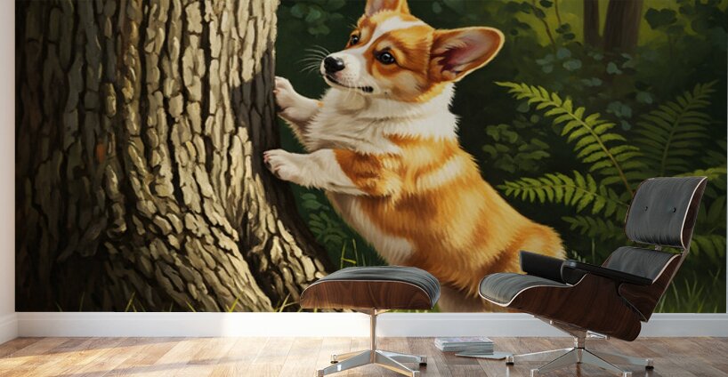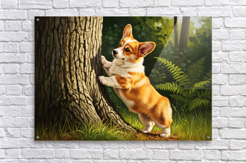 Get this artwork "Corgi Puppy Spots Squirrel At Tree Base" in a framed print.