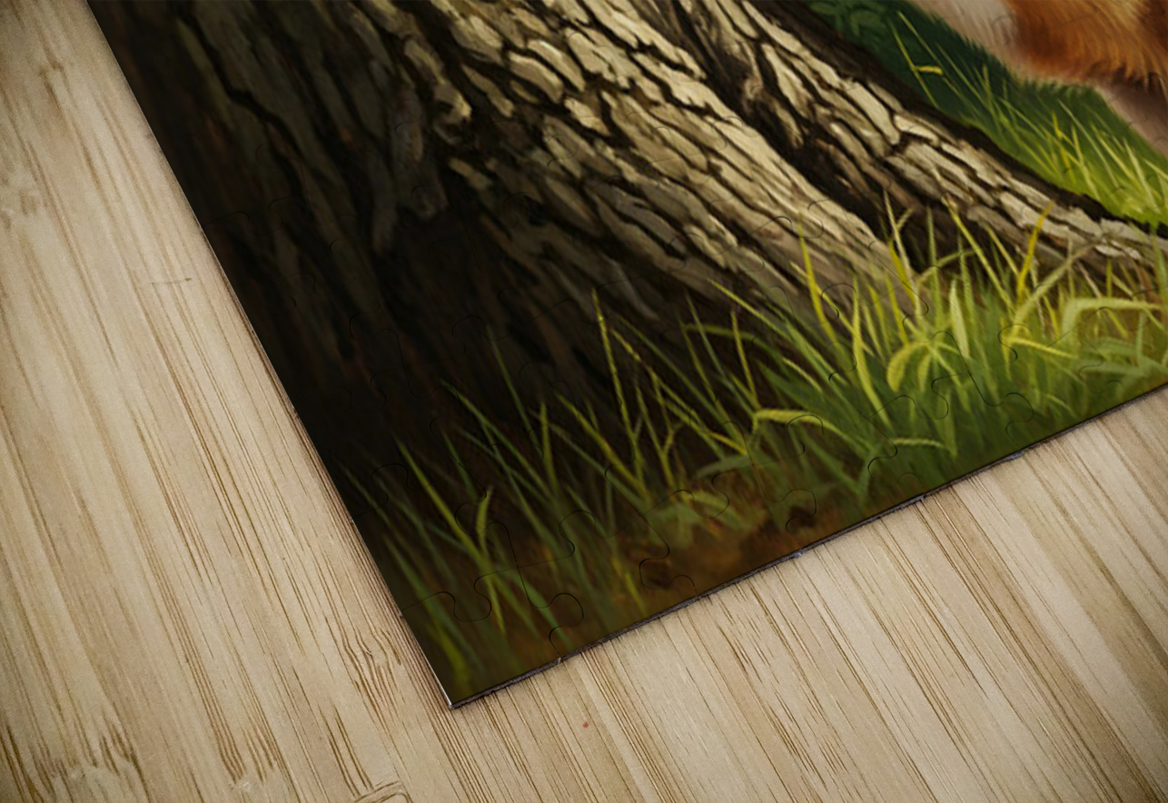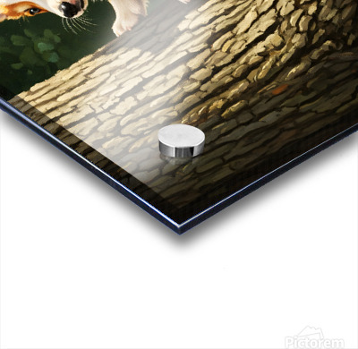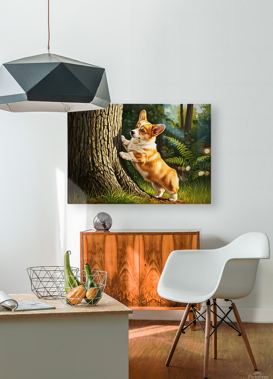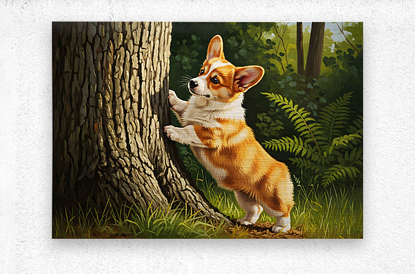 ABOUT THIS ARTWORK: CORGI PUPPY SPOTS SQUIRREL AT TREE BASE