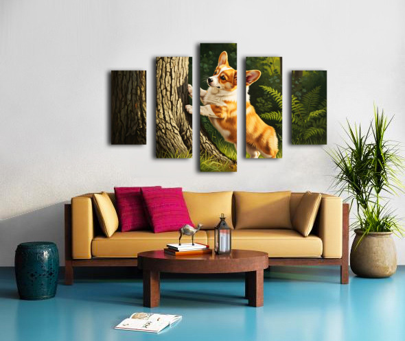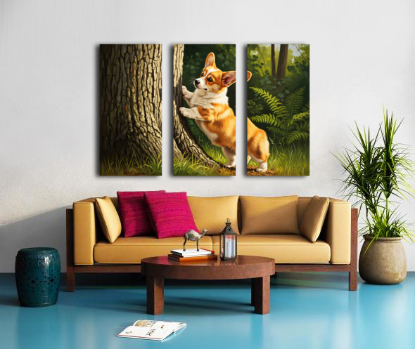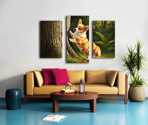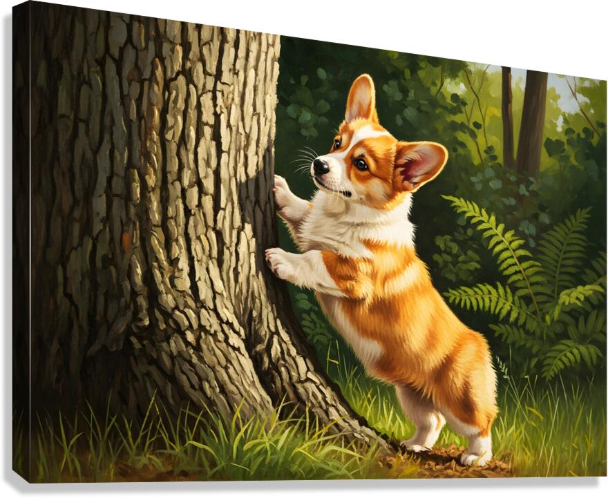 Corgi Puppy Spots Squirrel At Tree Base Canvas print