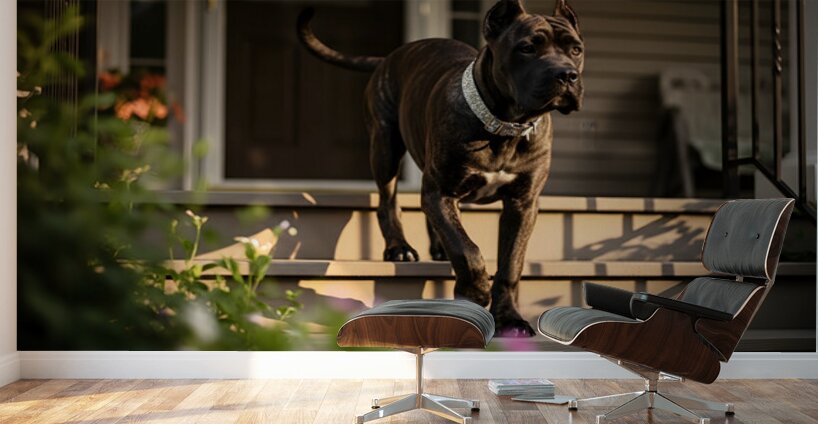 A young Cane Corso puppy with dark brindle markings sits before a mirror wearing a dazzling silver sparkly collar. The puppys tail wags with excitement as it admires its glamorous accessory in the soft bedroom lighting. Digital Artwork.