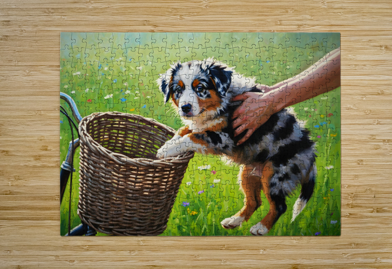 Australian Shepherd Puppy Discovers Bicycle Basket Adventure Puppy Prints Puzzle printing