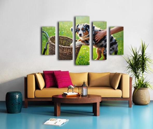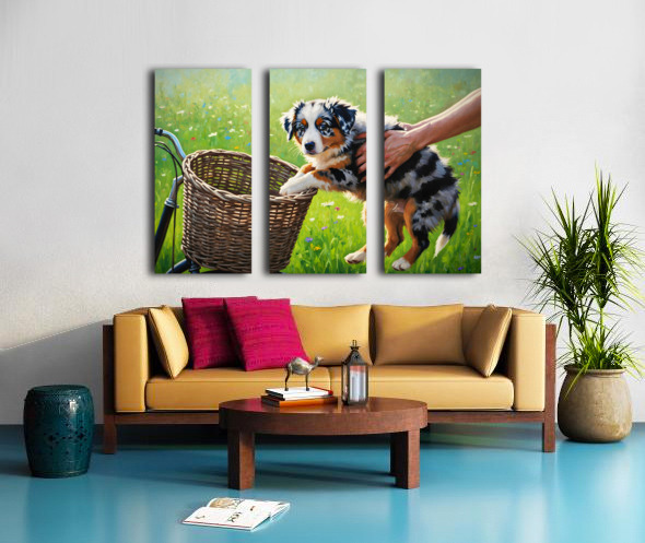 ABOUT THIS ARTWORK: AUSTRALIAN SHEPHERD PUPPY DISCOVERS BICYCLE BASKET ADVENTURE