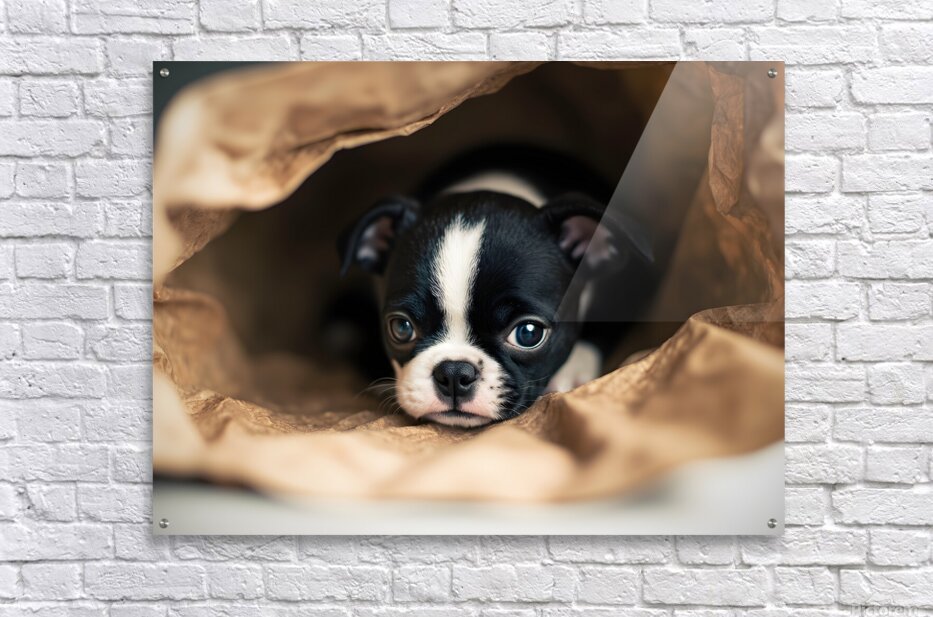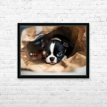 Boston Terrier Puppy Discovers Mysterious Shopping Bag Picture Frame Printing