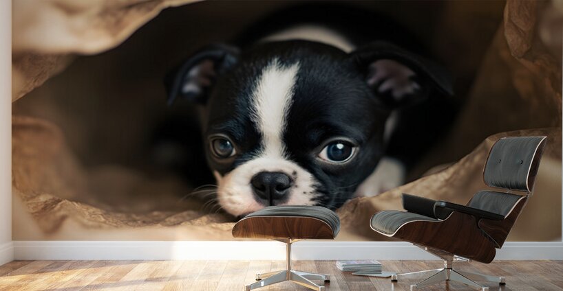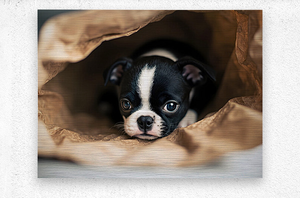 A curious black and white Boston Terrier puppy with distinctive markings approaches a brown paper shopping bag on wooden flooring tilting its small head with interest toward the mysterious object. Digital Artwork.