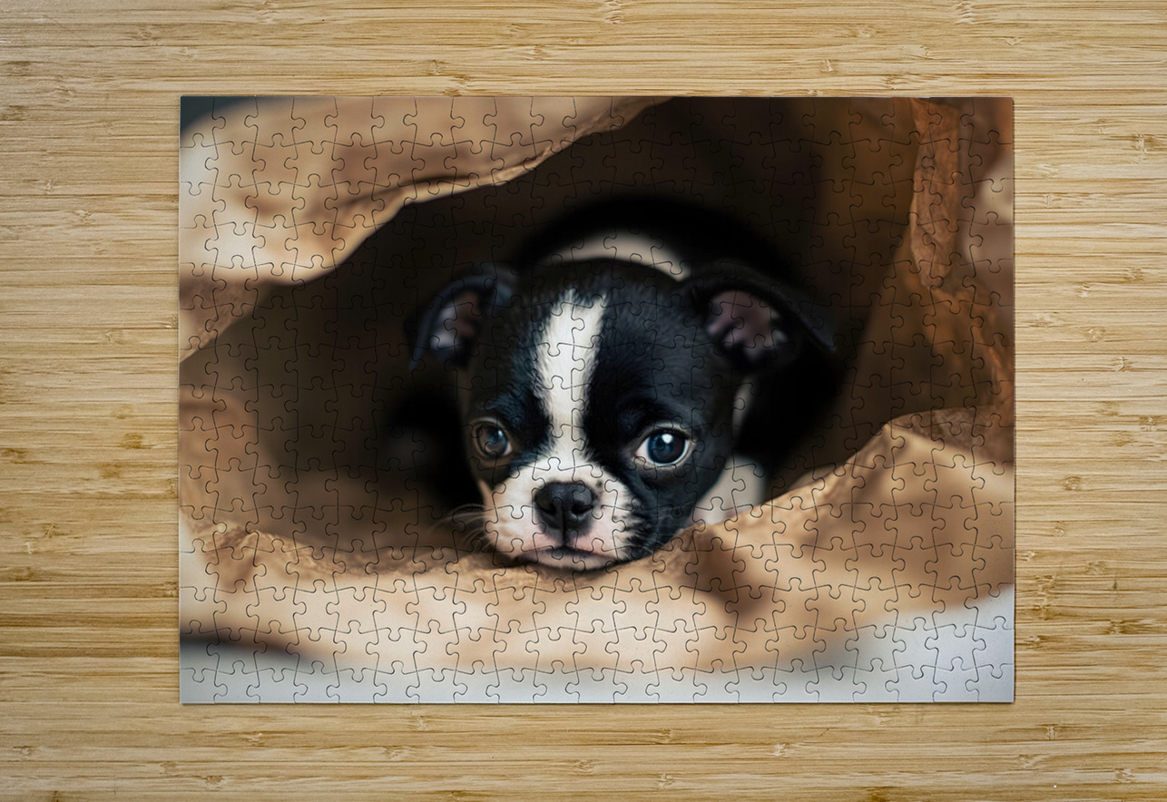 Boston Terrier Puppy Discovers Mysterious Shopping Bag Puppy Prints Puzzle printing