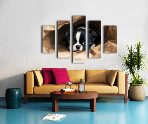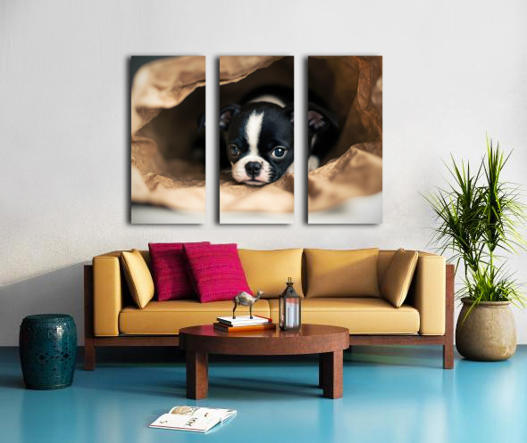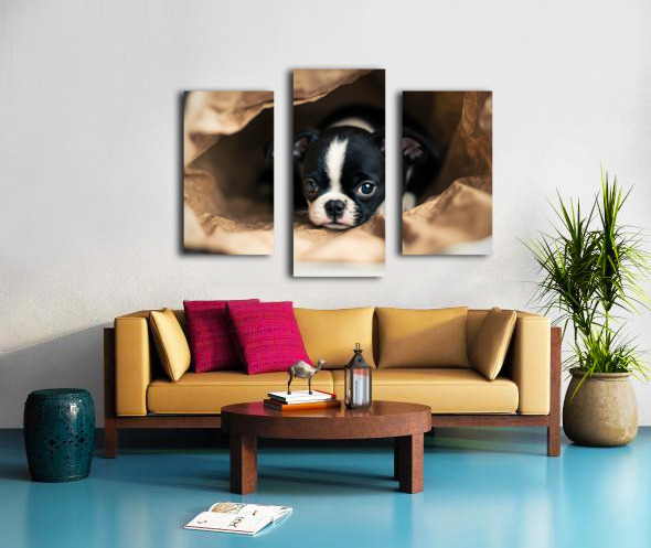 Boston Terrier Puppy Discovers Mysterious Shopping Bag Canvas print
