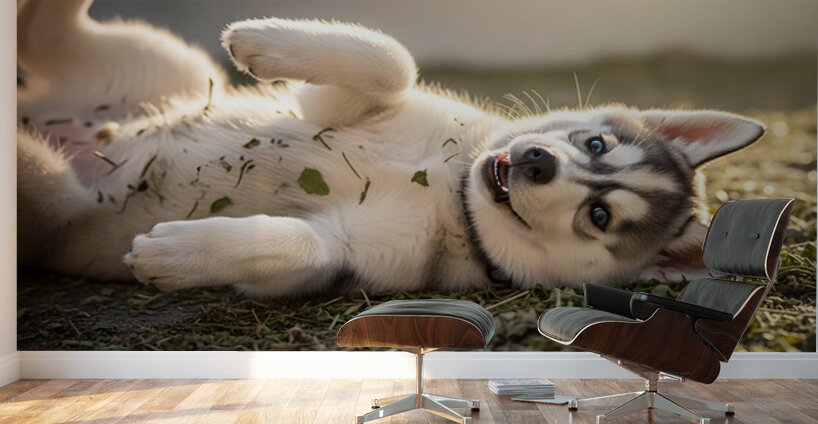 The satisfied Siberian Husky puppy sits proudly with dried herbs decorating its gray and white fur pink tongue lolling out in a happy expression after its aromatic adventure Digital Artwork.