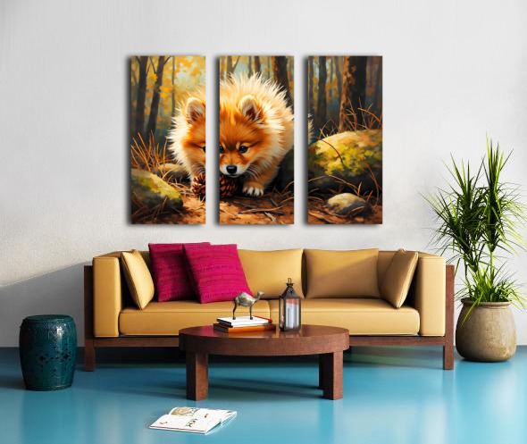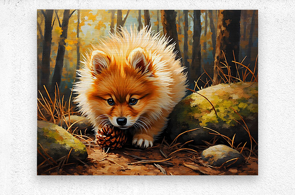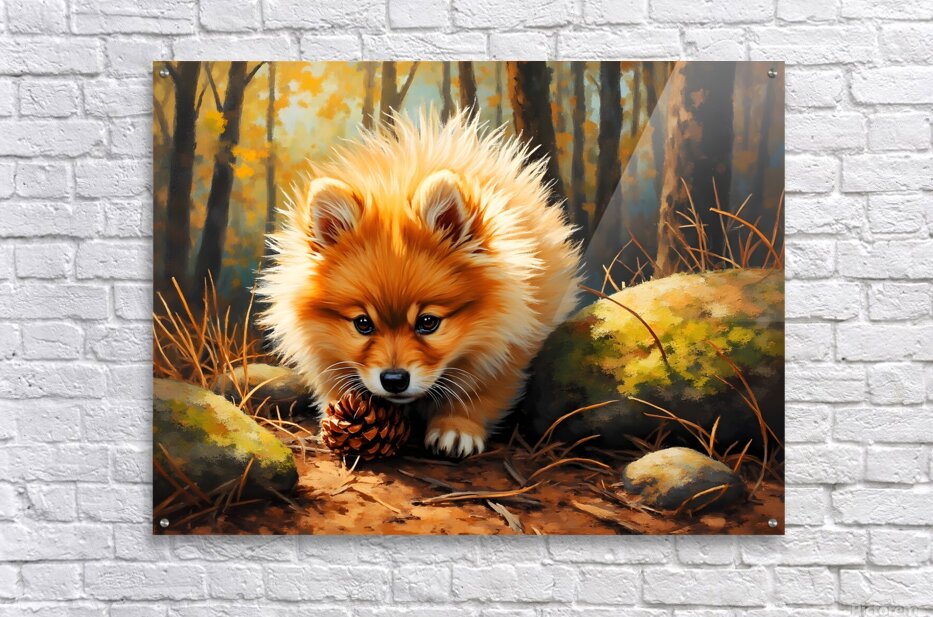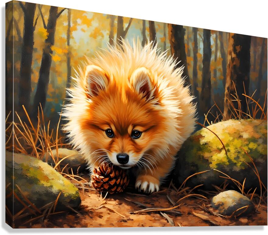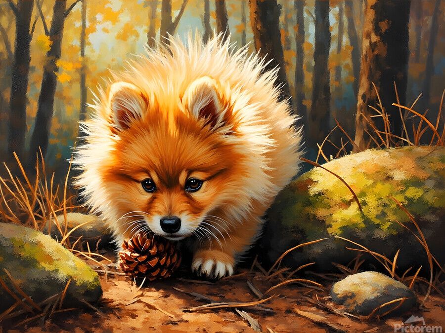 Get this artwork "Pomeranian Puppy Discovers Pinecone In Forest" in a framed print.