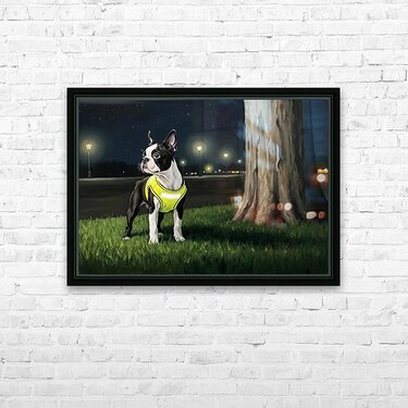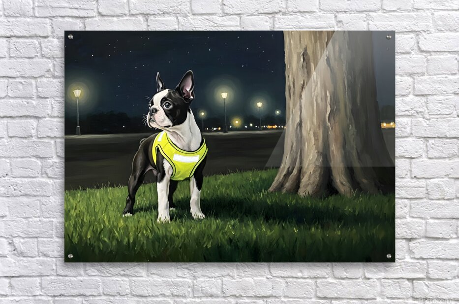 Get this artwork "Sleepy Boston Terrier Puppy Returns From Night Walk" in a framed print.