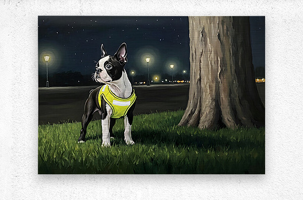 ABOUT THIS ARTWORK: SLEEPY BOSTON TERRIER PUPPY RETURNS FROM NIGHT WALK