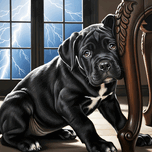 A worried black Cane Corso puppy with soft floppy ears hides beneath a wooden dining table. The small dogs dark coat contrasts with the warm wood as storm clouds loom outside the window. Digital Artwork.