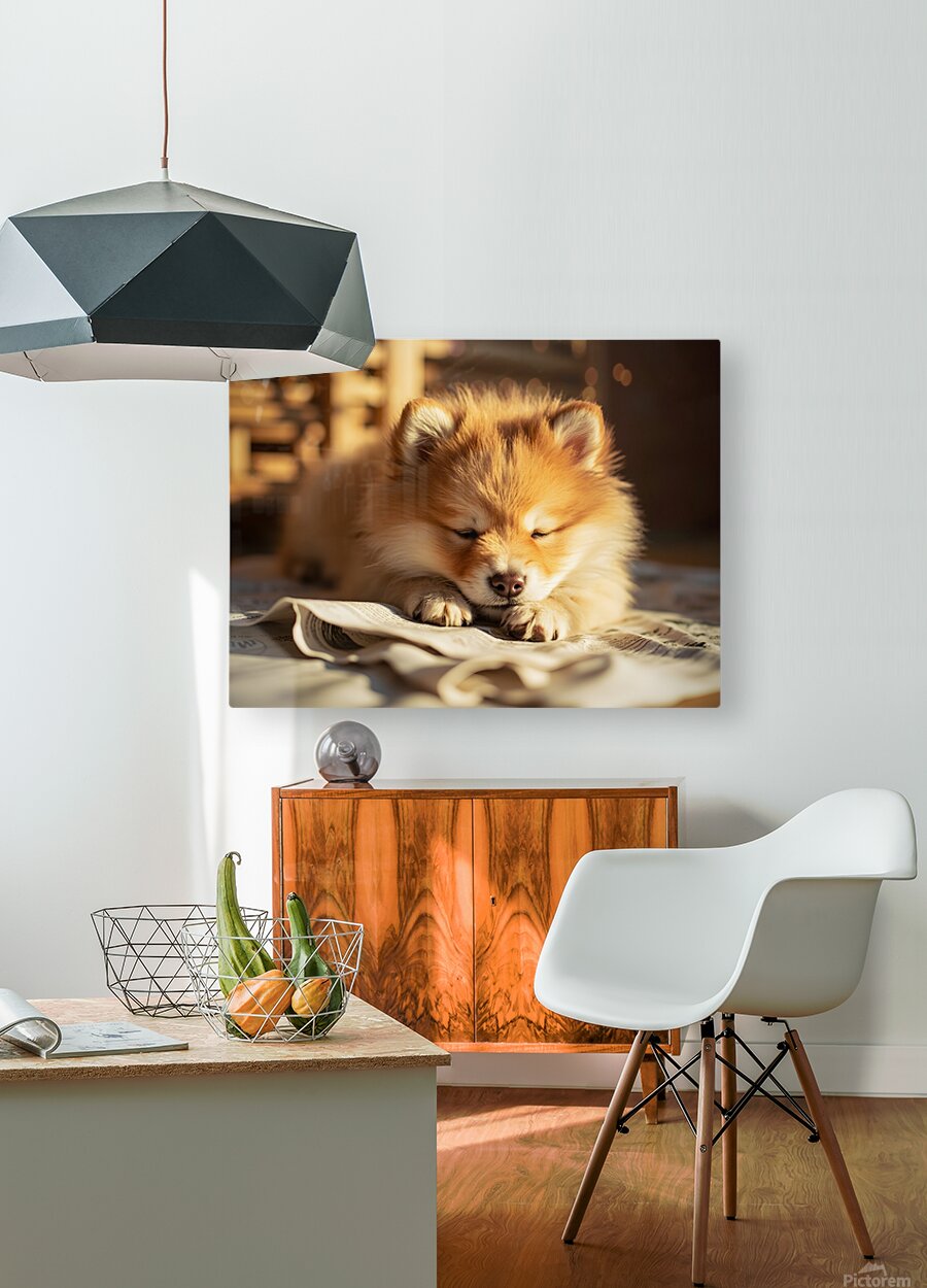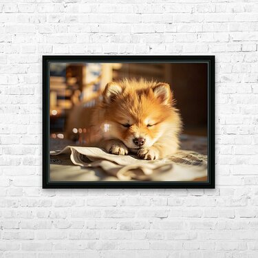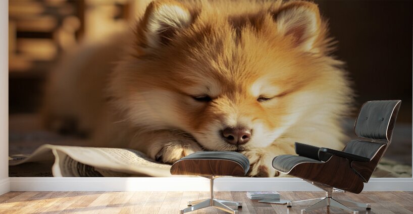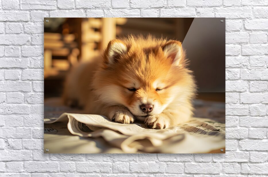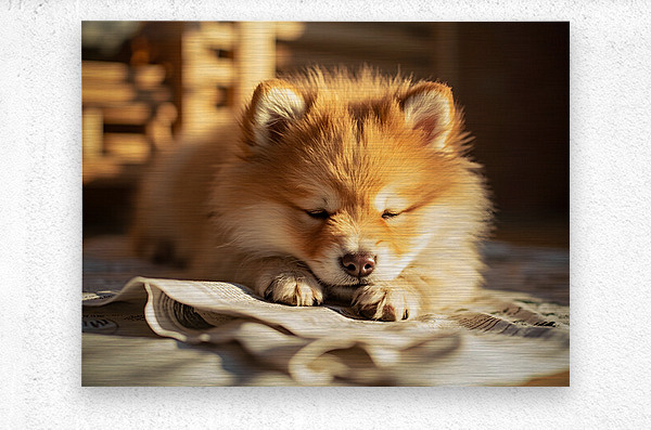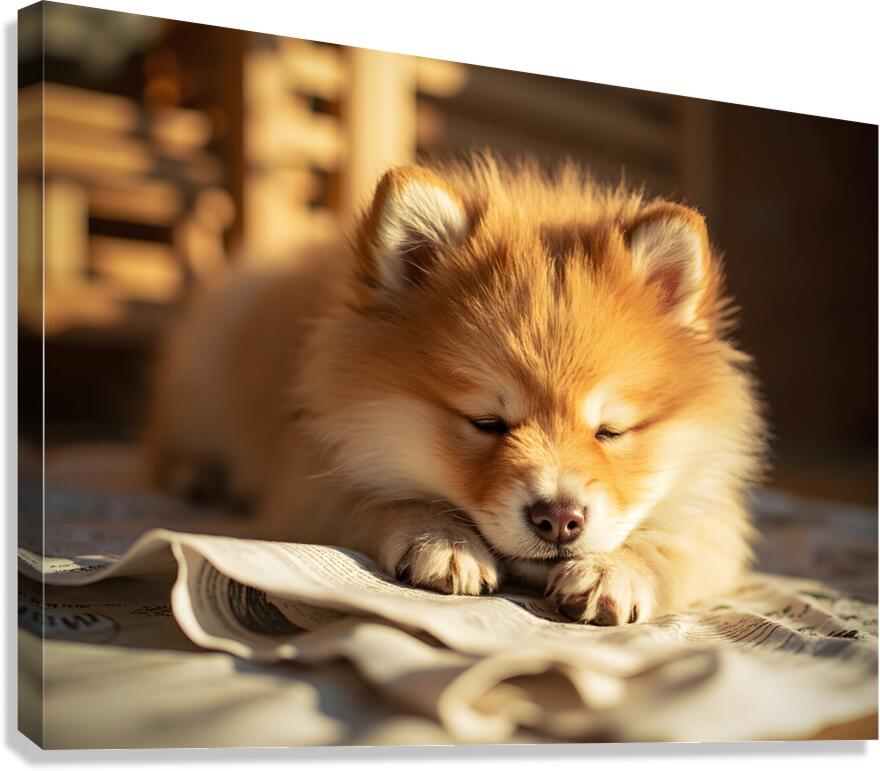 An energetic orange and white Pomeranian puppy stands alertly on newspaper pages with tail wagging and bright eyes looking upward ready for the next activity Digital Artwork.