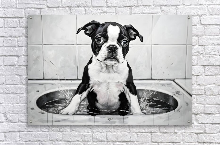 ABOUT THIS ARTWORK: HAPPY BOSTON TERRIER PUPPY ENJOYS SUDSY BATH TIME