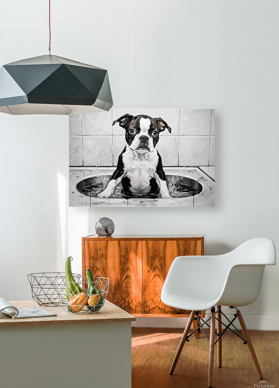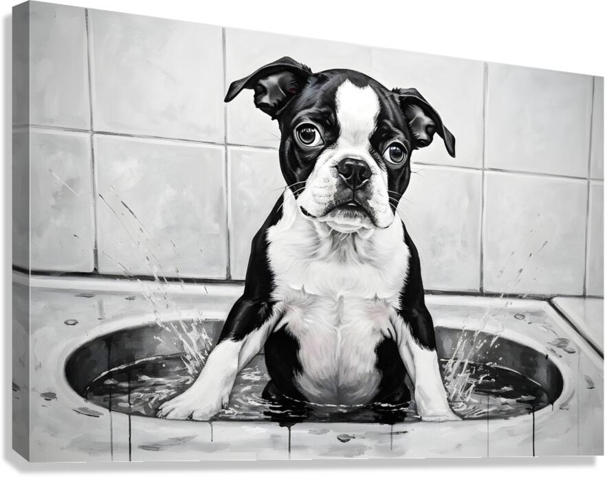 ABOUT THIS ARTWORK: HAPPY BOSTON TERRIER PUPPY ENJOYS SUDSY BATH TIME