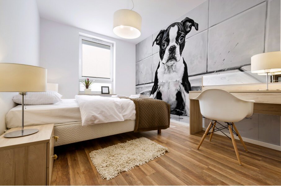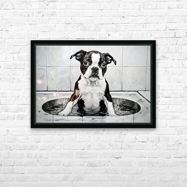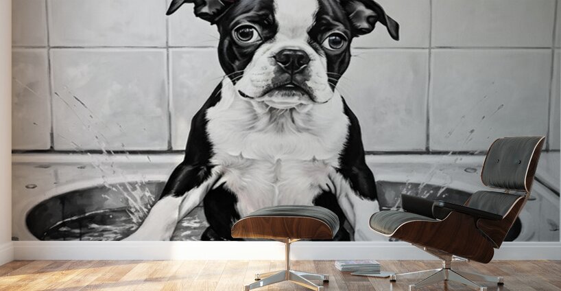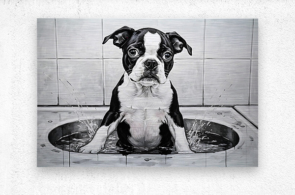 The Boston Terrier puppy appears relaxed and happy surrounded by sudsy bath water. With bright eyes and a hint of pink tongue showing the puppys tail wags gently as it enjoys the warm bath. Digital Artwork.