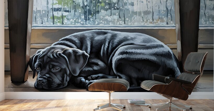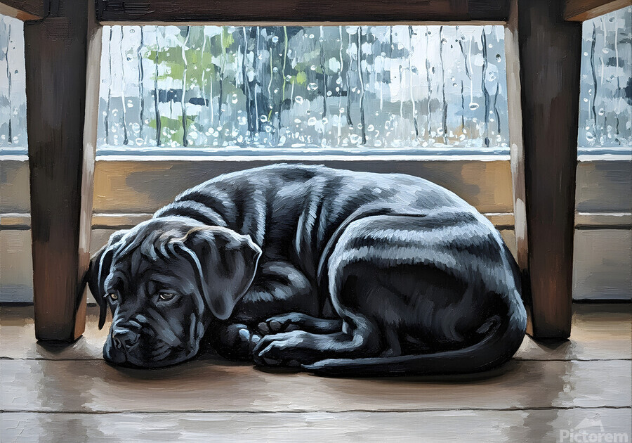The black Cane Corso puppy carefully peeks out from its hiding spot under the table. One ear stands alert as gentler light filters through the windows showing the young dogs returning courage. Digital Artwork.