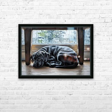 The black Cane Corso puppy carefully peeks out from its hiding spot under the table. One ear stands alert as gentler light filters through the windows...[+]