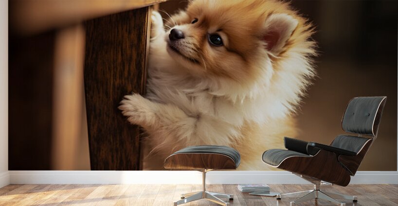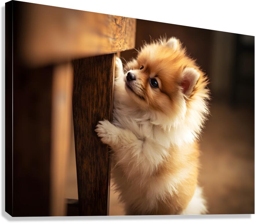 A tiny orange and white Pomeranian puppy sits eagerly on the floor beside a wooden table where family members are enjoying a board game together the puppys fluffy tail wagging with excitement Digital Artwork.