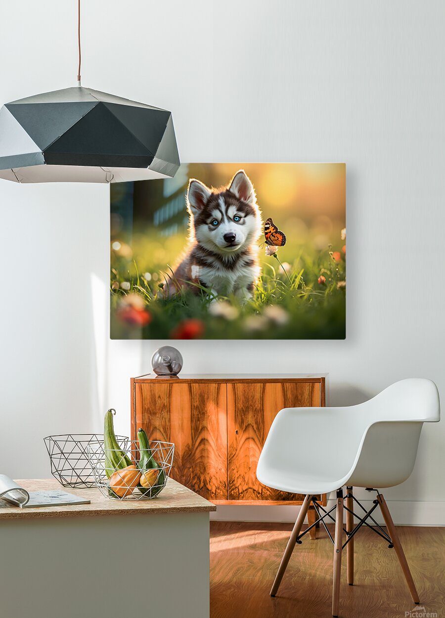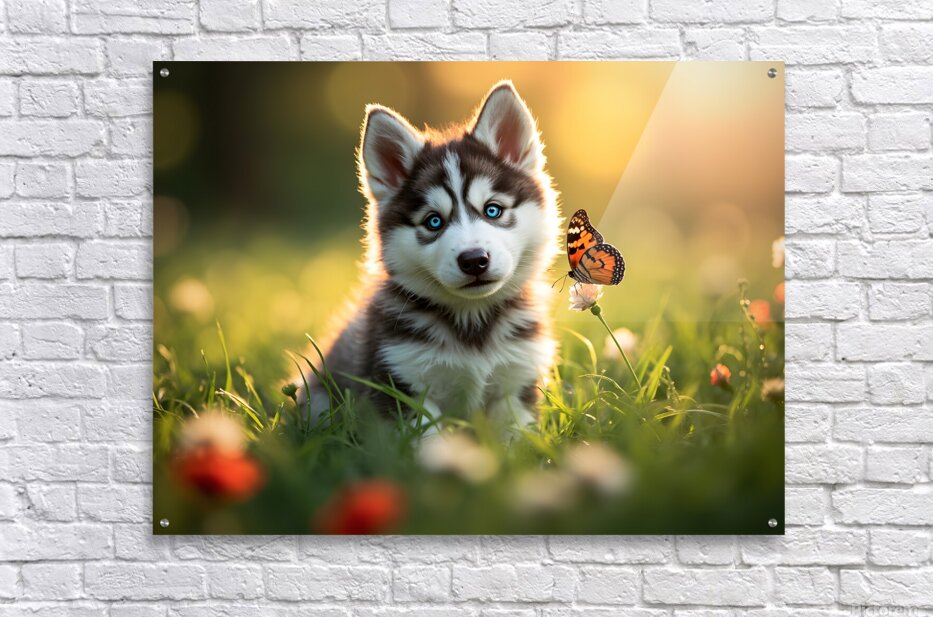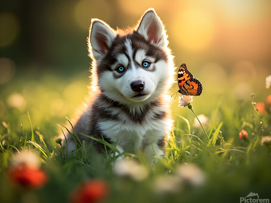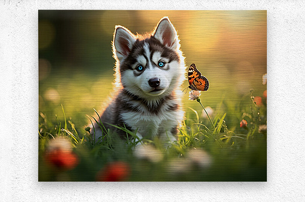 ABOUT THIS ARTWORK: BUTTERFLY LANDS GENTLY ON HUSKY PUPPYS NOSE