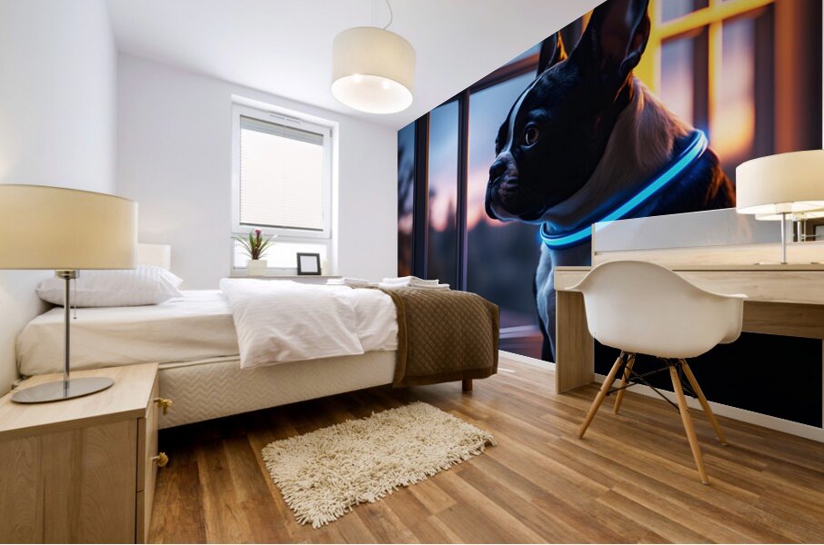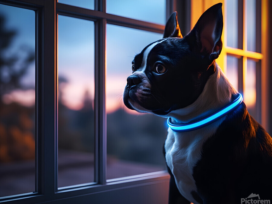 A small Boston Terrier puppy with distinctive black and white fur sits on wooden flooring wearing a bright blue illuminated collar. The puppys ears are perked up with excitement and its dark eyes sparkle with curiosity about the glowing accessory. Digital Artwork.