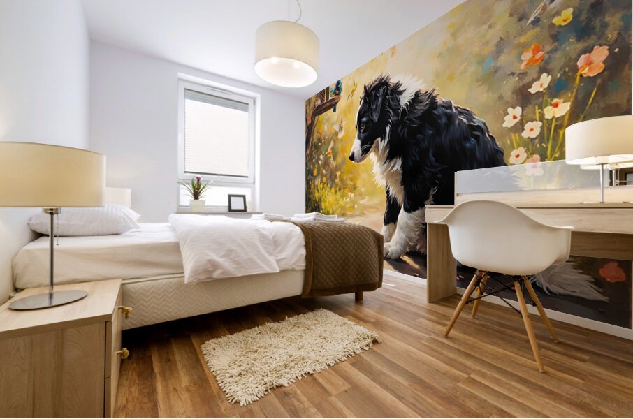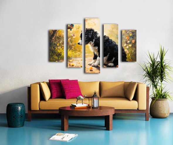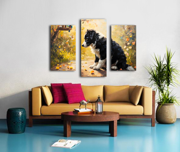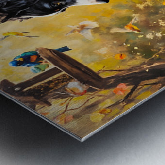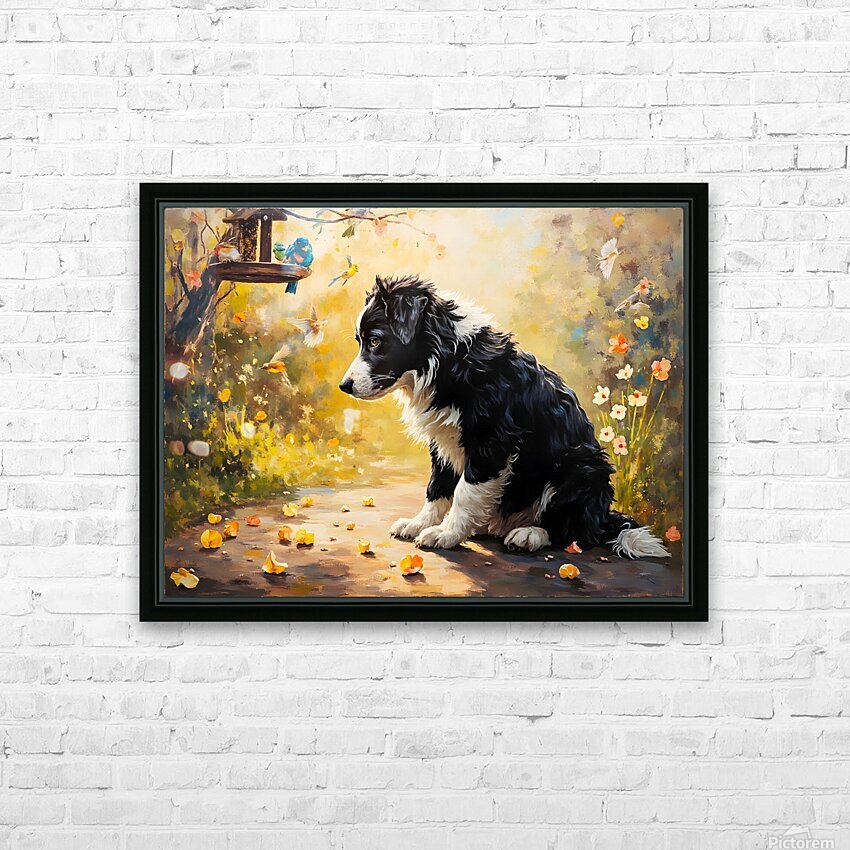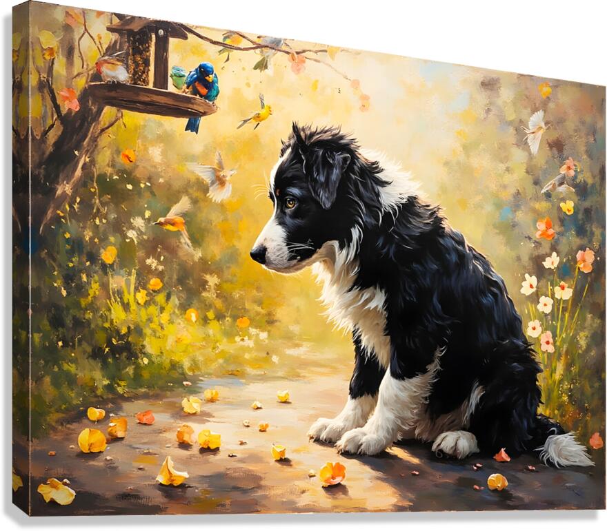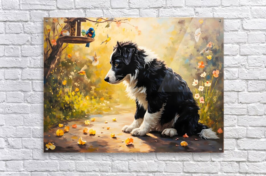 ABOUT THIS ARTWORK: CONTENT BORDER COLLIE PUPPY ENJOYS WATCHING BIRDS FROM GARDEN BELOW