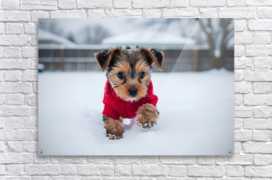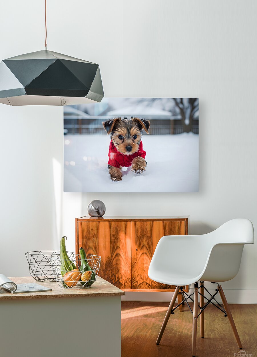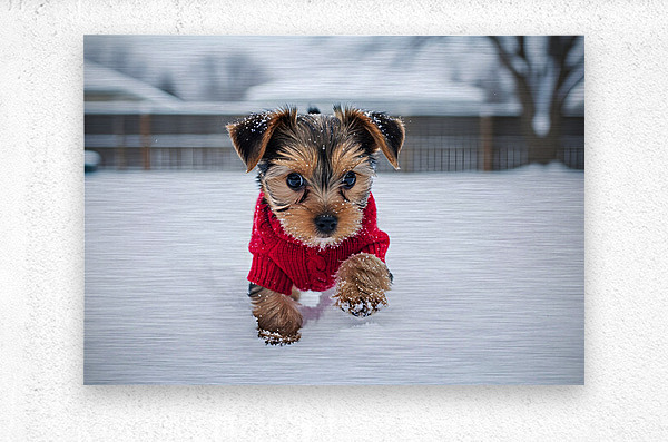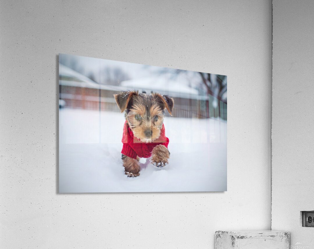 Get this artwork "Yorkshire Terrier Puppy Watches Winter Snow Fall" in a framed print.