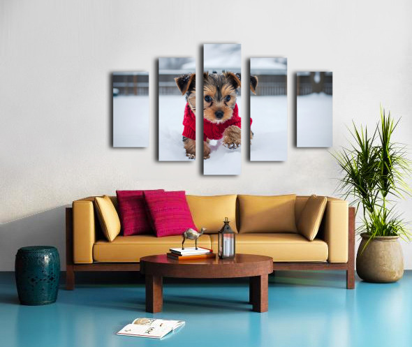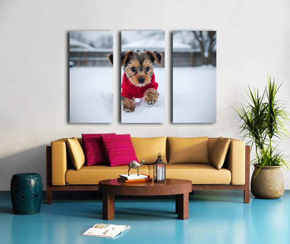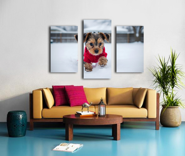 Yorkshire Terrier Puppy Watches Winter Snow Fall Canvas print