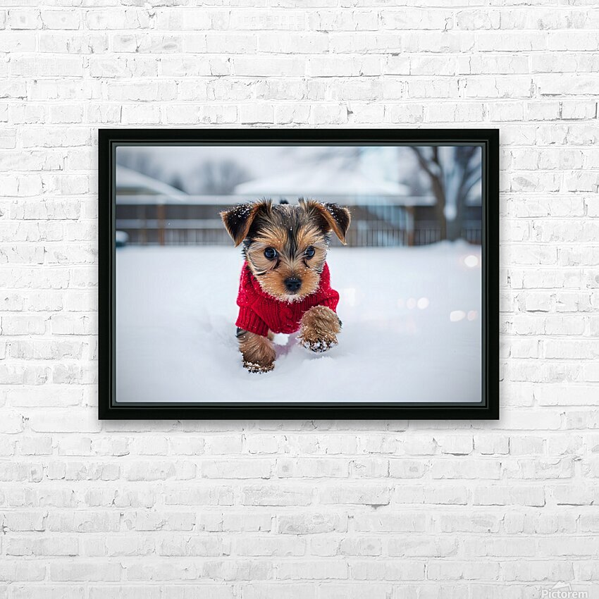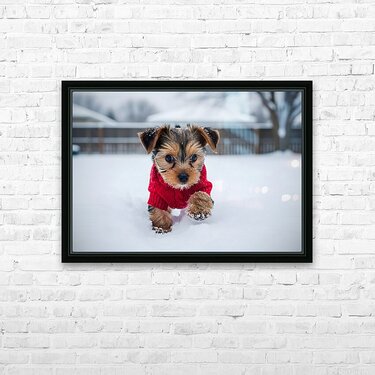 Yorkshire Terrier Puppy Watches Winter Snow Fall Picture Frame Printing