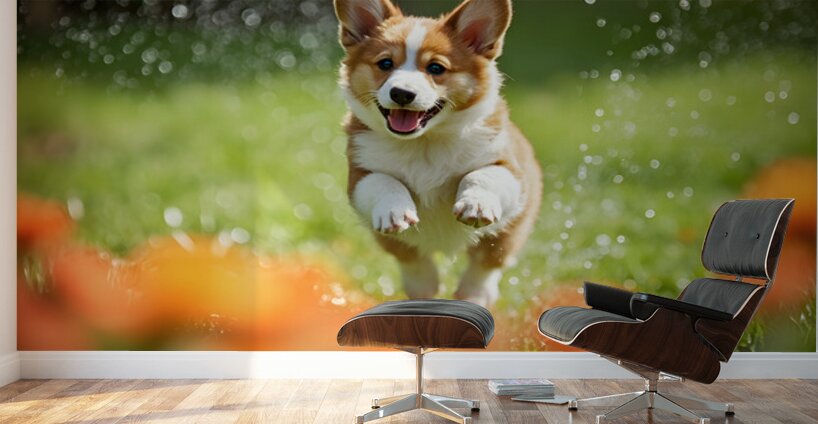 An adorable orange and white Pembroke Welsh Corgi puppy with distinctive short legs and pointed ears runs excitedly across bright green grass as water sprays from a tall sprinkler creating glittering droplets in the warm sunlight Digital Artwork.