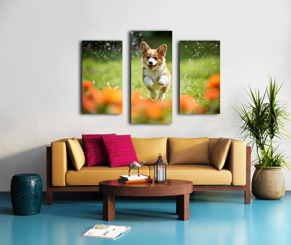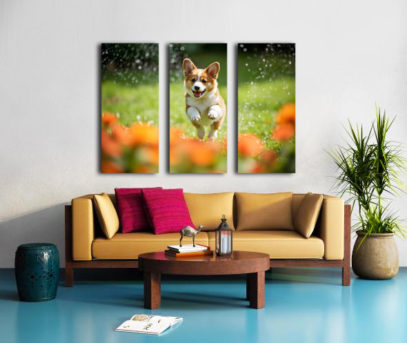Corgi Puppy Discovers The Magical Water Fountain Canvas print