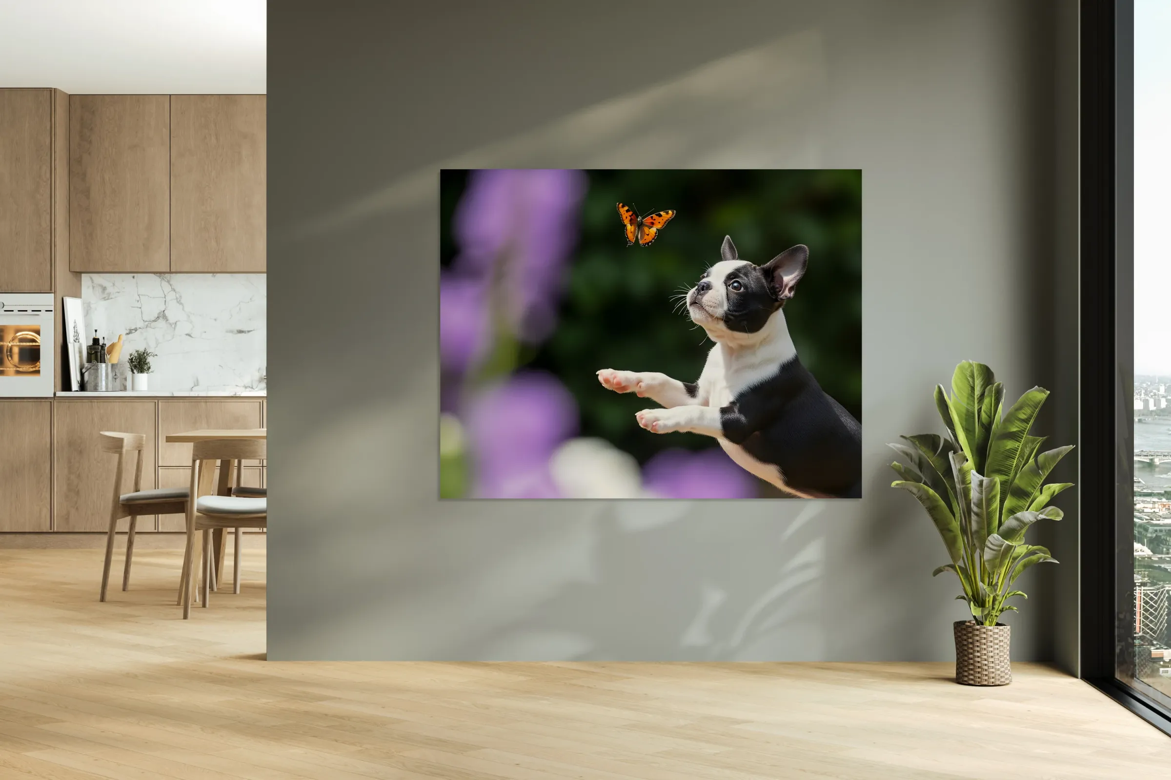 ABOUT THIS ARTWORK: BOSTON TERRIER PUPPY SPOTS BUTTERFLY IN GARDEN