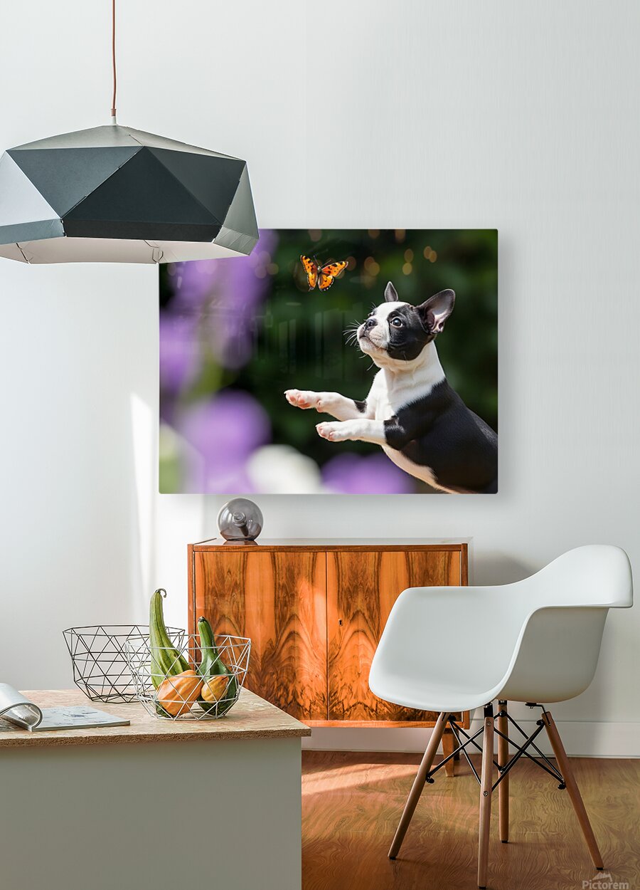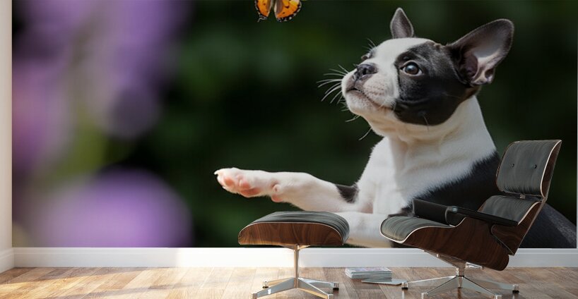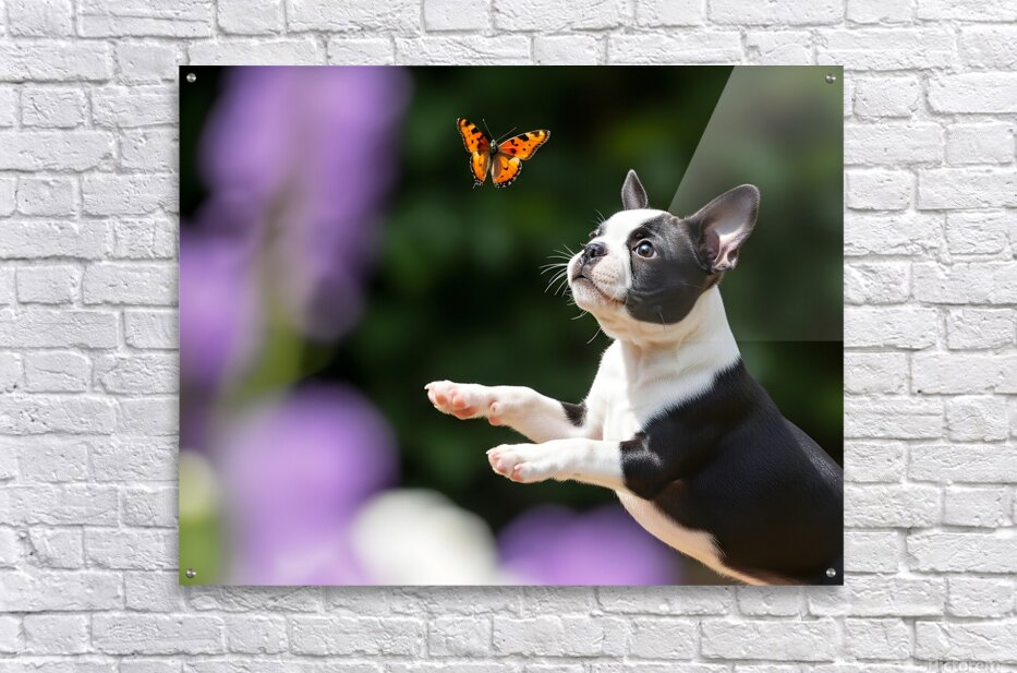 Get this artwork "Boston Terrier Puppy Spots Butterfly In Garden" in a framed print.