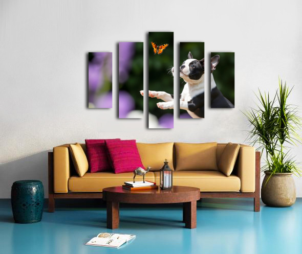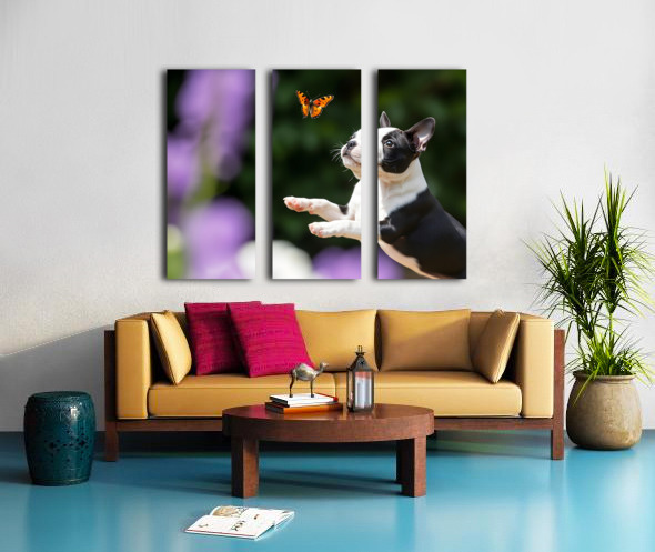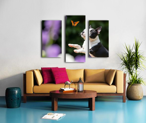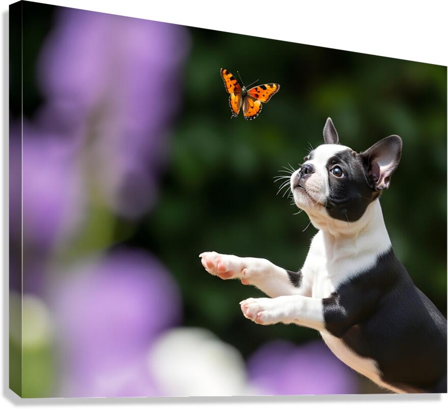 Boston Terrier Puppy Spots Butterfly In Garden Canvas print