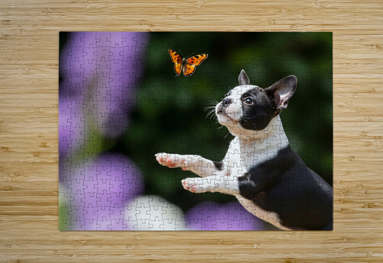 Boston Terrier Puppy Spots Butterfly In Garden Puppy Prints Puzzle printing