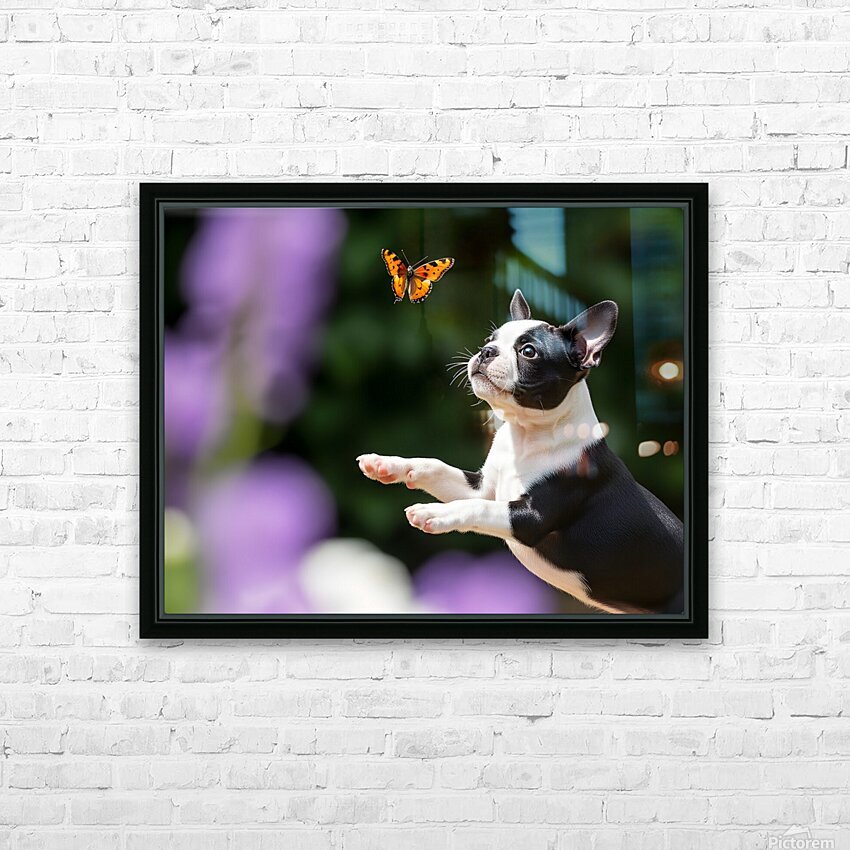 Boston Terrier Puppy Spots Butterfly In Garden Picture Frame Printing