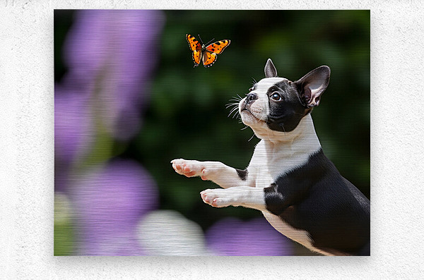 ABOUT THIS ARTWORK: BOSTON TERRIER PUPPY SPOTS BUTTERFLY IN GARDEN