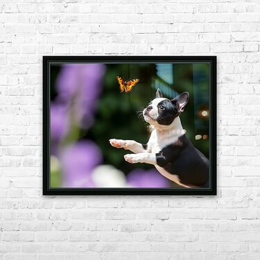 Get this artwork "Boston Terrier Puppy Spots Butterfly In Garden" in a framed print.