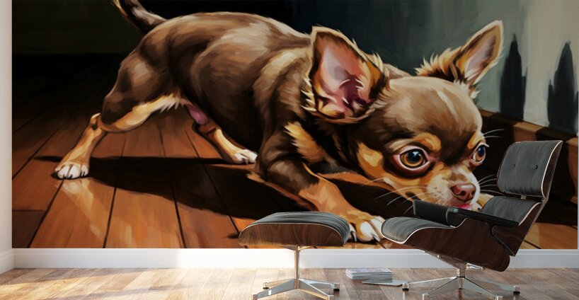 A small brown and tan Chihuahua puppy sits alert on polished wooden flooring gazing upward with bright curious eyes at mysterious dark shapes moving across a plain white wall above. Digital Artwork.