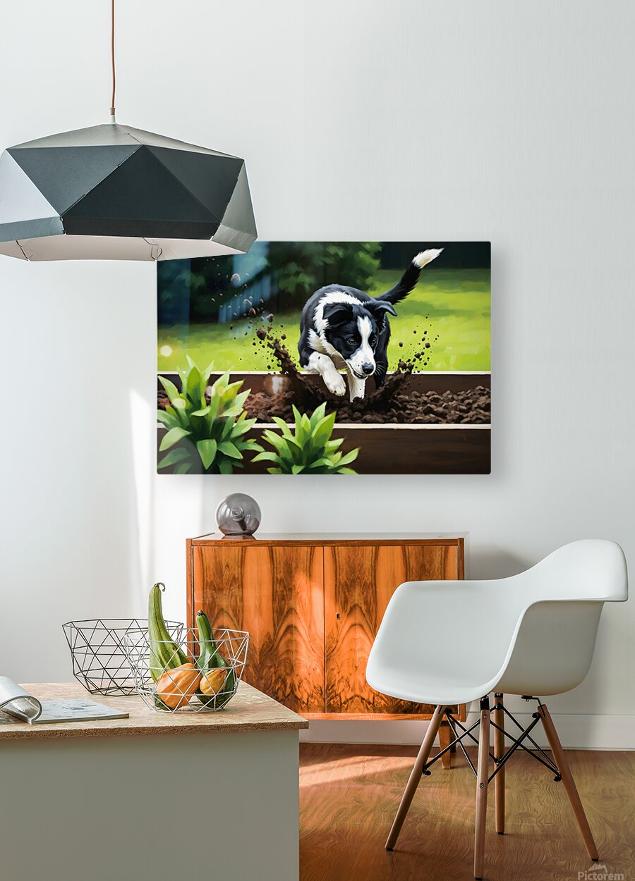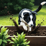 An adorable black and white Border Collie puppy gazes with excitement at a raised wooden garden bed full of dark soil. The puppys fluffy coat and bright curious eyes show pure joy at discovering this new adventure. Digital Artwork.