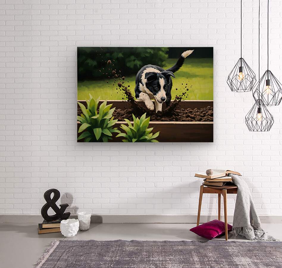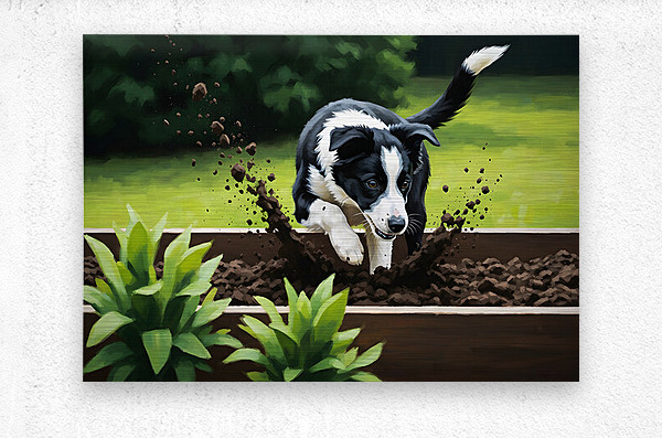 ABOUT THIS ARTWORK: BORDER COLLIE PUPPY DISCOVERS GARDEN BED