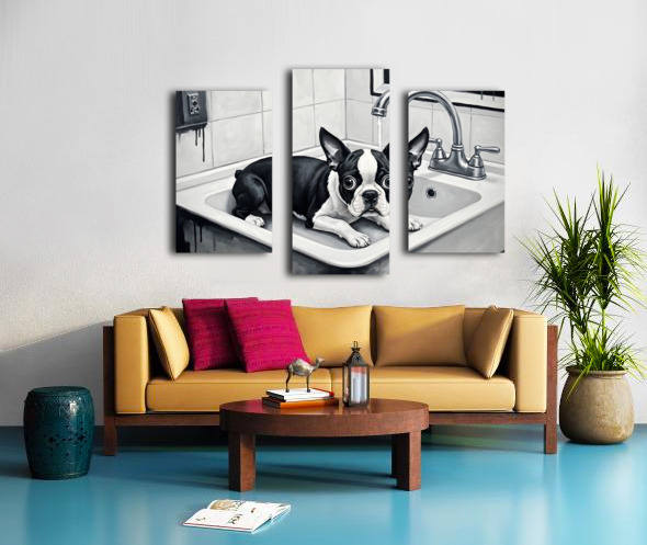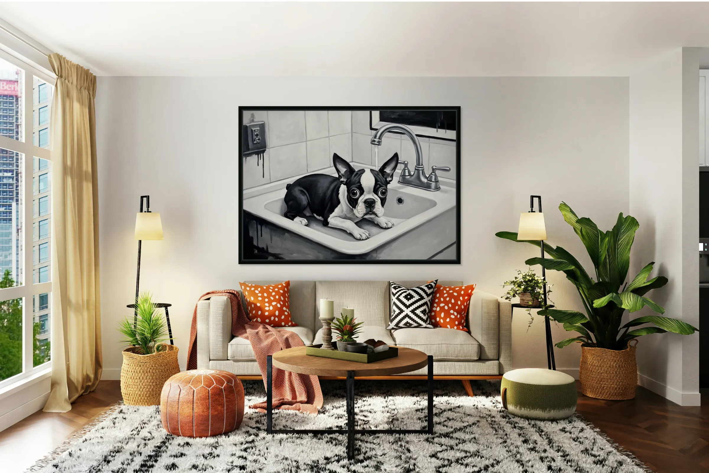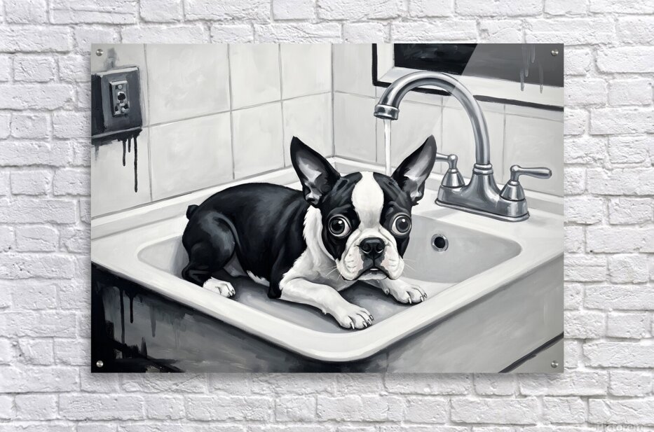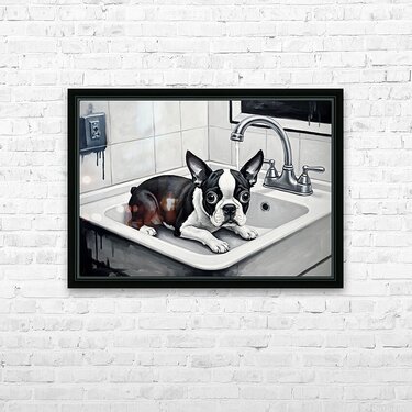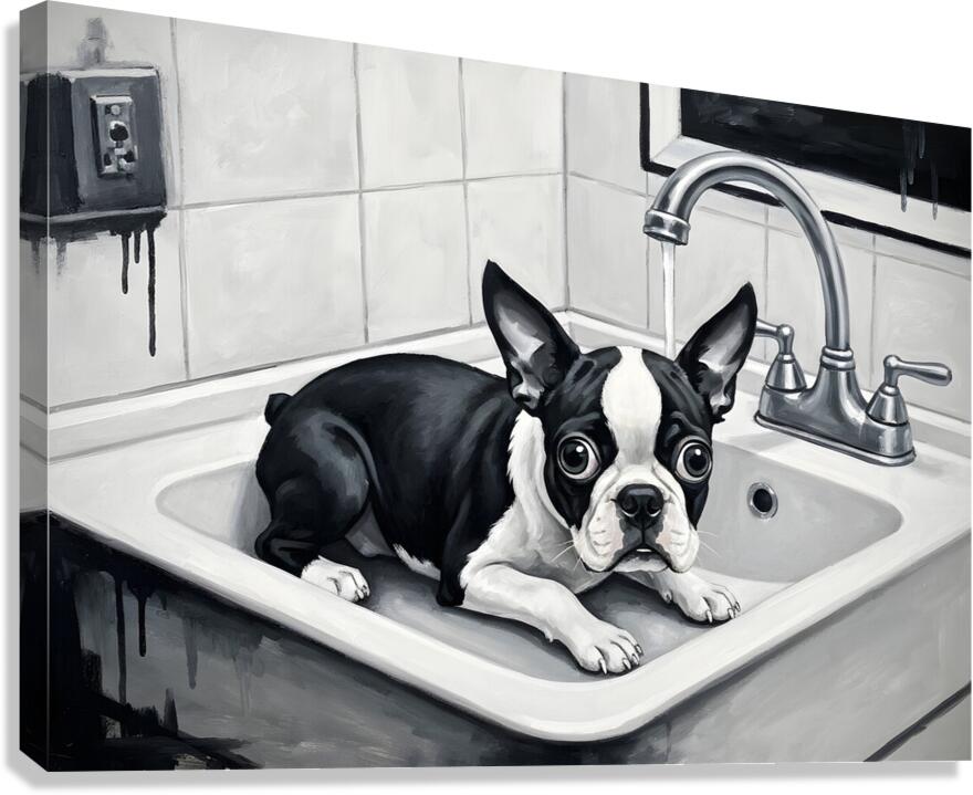 Get this artwork "Boston Terrier Puppy Waits Nervously In Bathroom Sink" in a framed print.